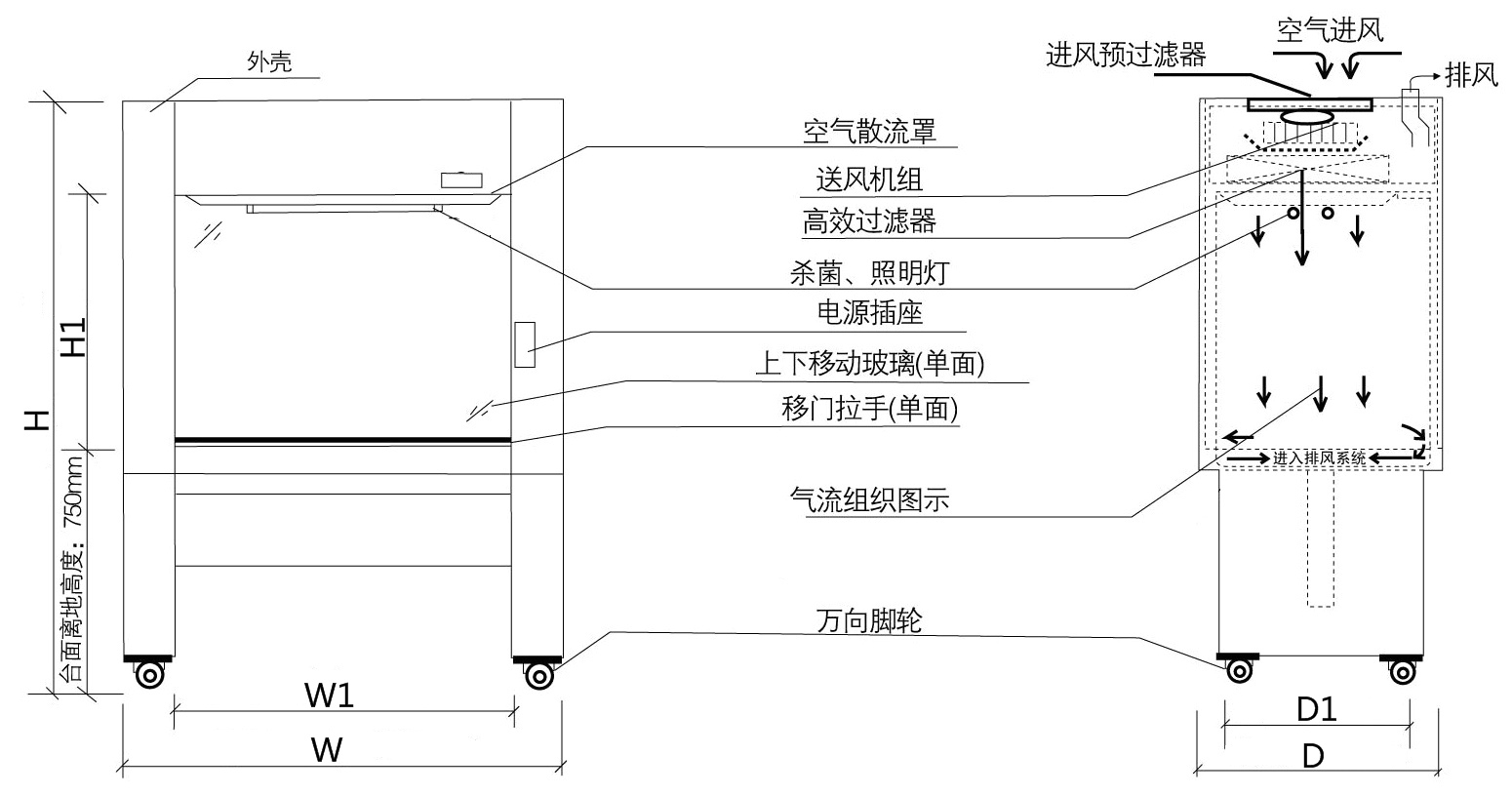 凈化工作臺由箱體、風機、高效過濾器、操作開關等幾大部件組成。箱體采用彩鋼板等制作,表面噴塑處理,工作臺面采用不銹鋼制作。凈化單元采用了可調風量的風機系統,通過調節風機的工作狀態,可使潔凈工作區中的平均風速保持額定范圍內,而且有效地延長了高效過濾器使用壽命。